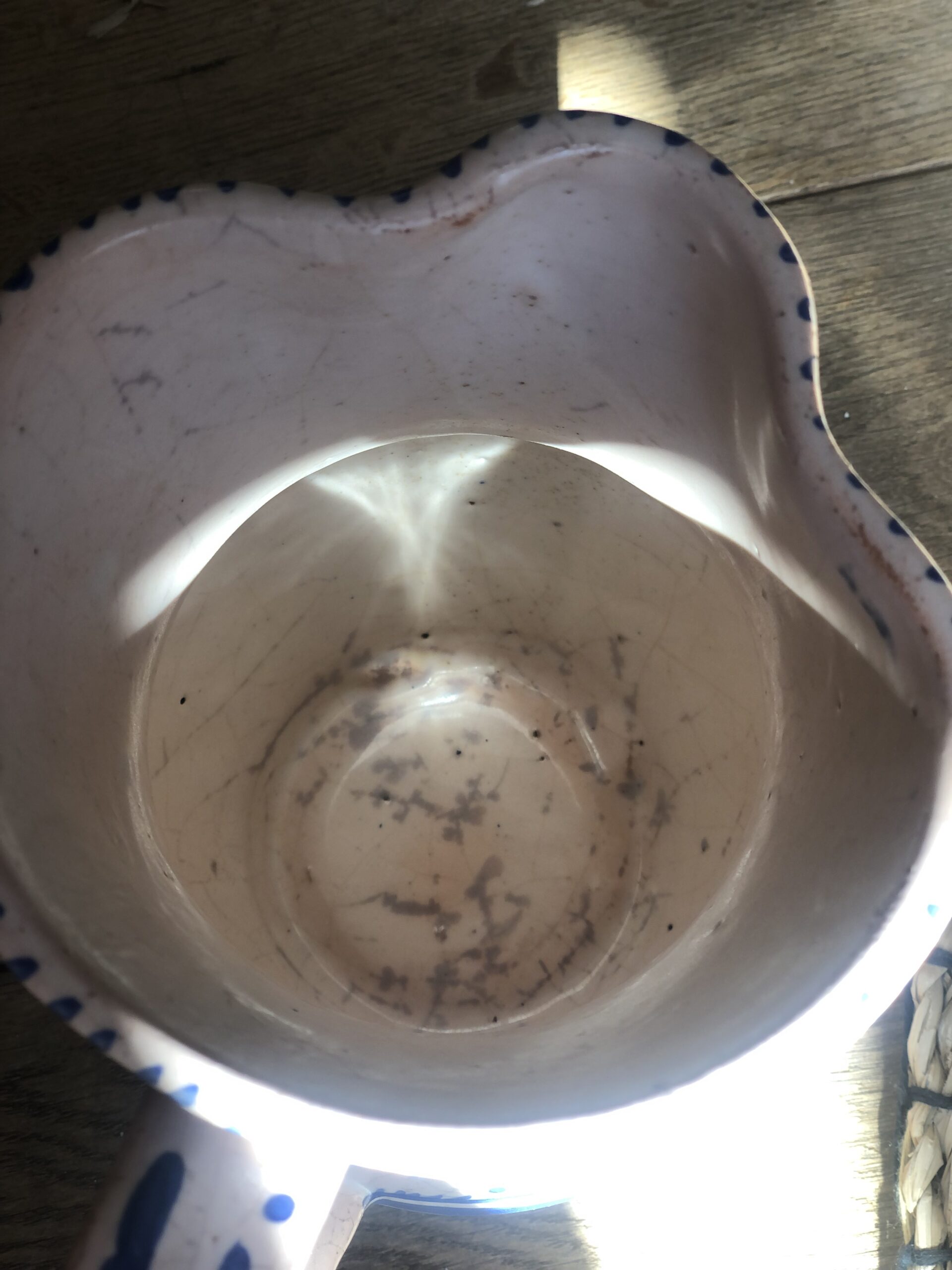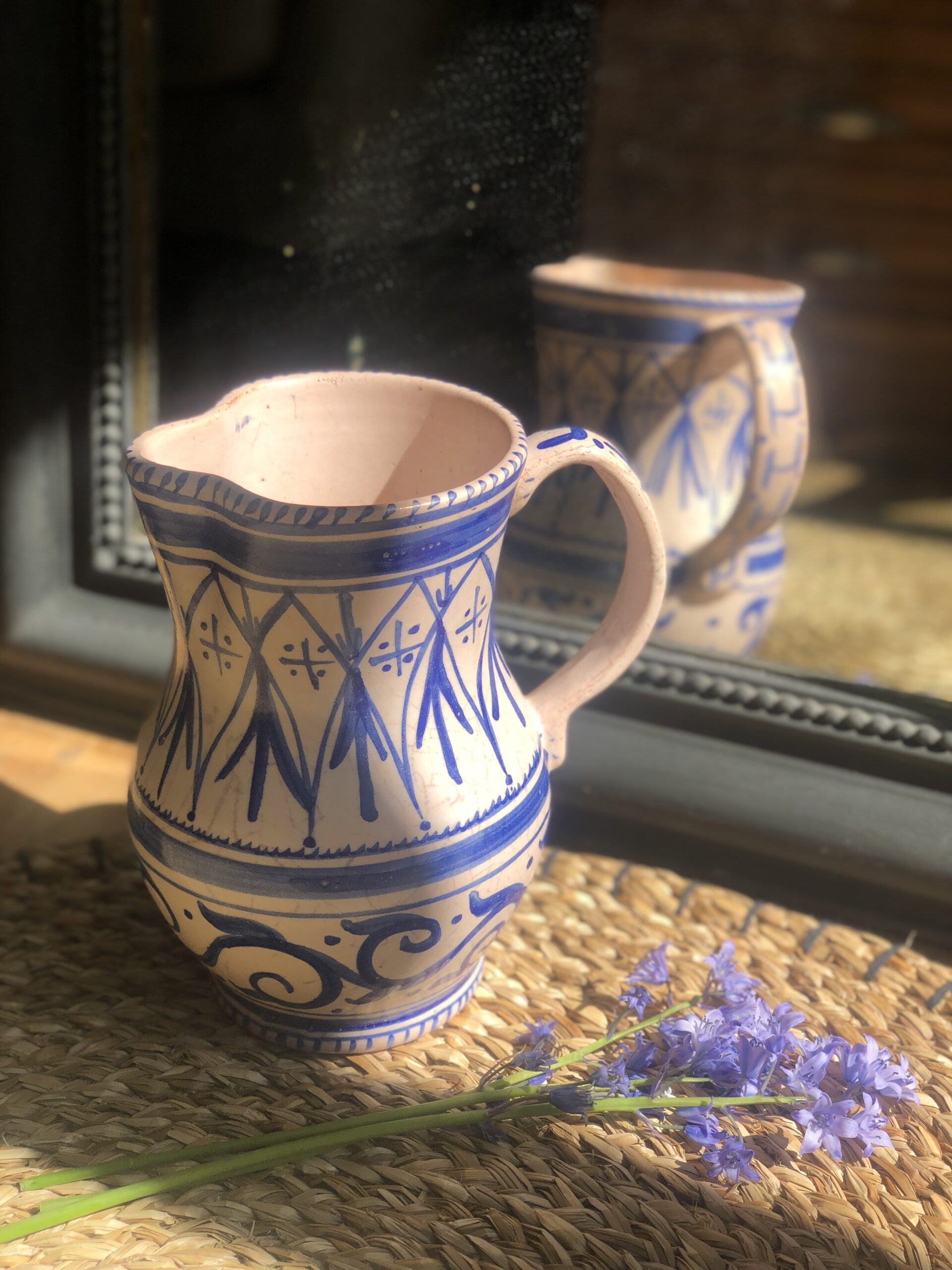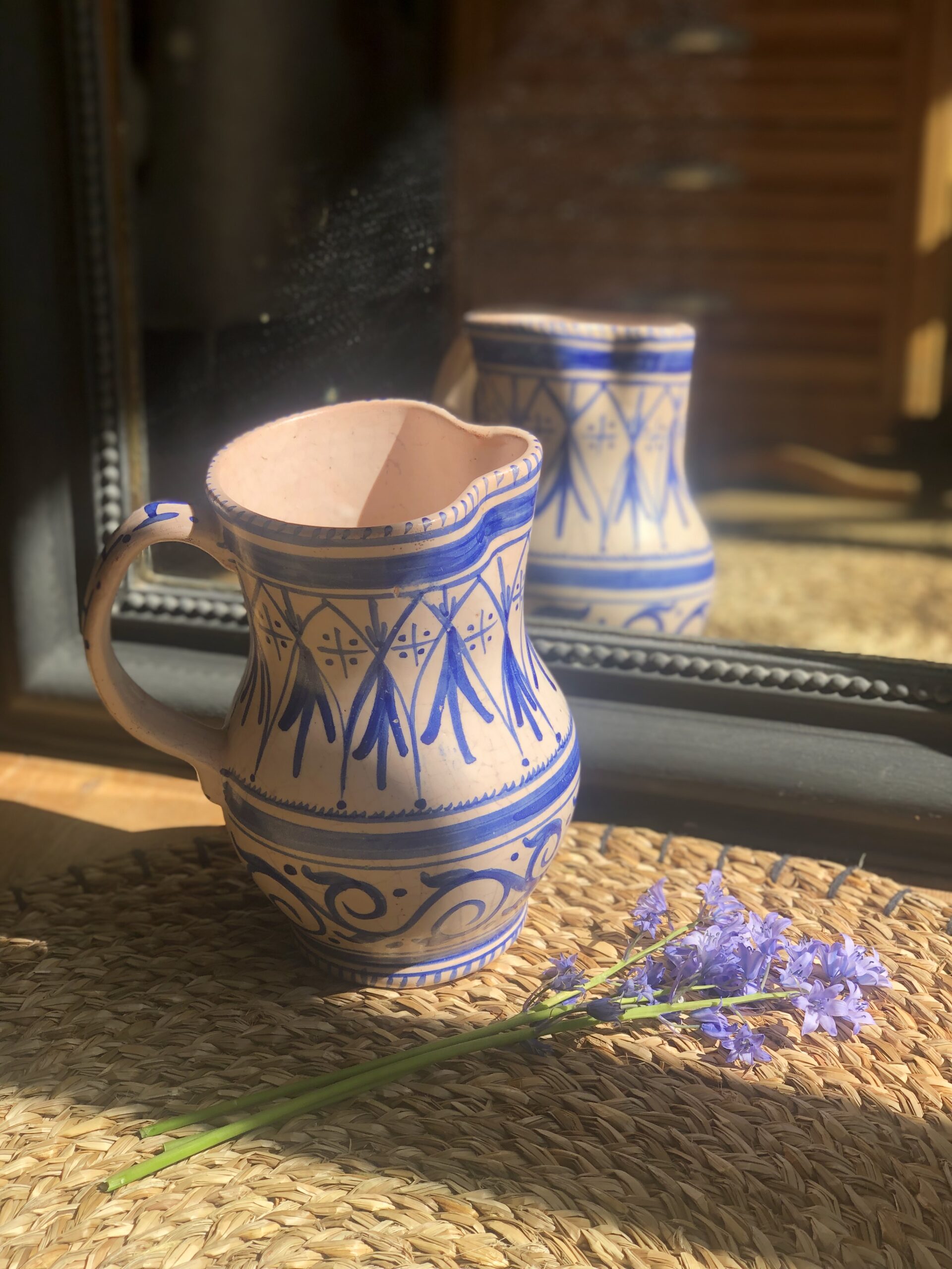 Charmante cruche en céramique artisanale signée Artesa, décorée à la main de motifs bleus d’inspiration méditerranéenne. Sa forme élégante et légèrement irrégulière lui confère tout le charme des pièces faites main.