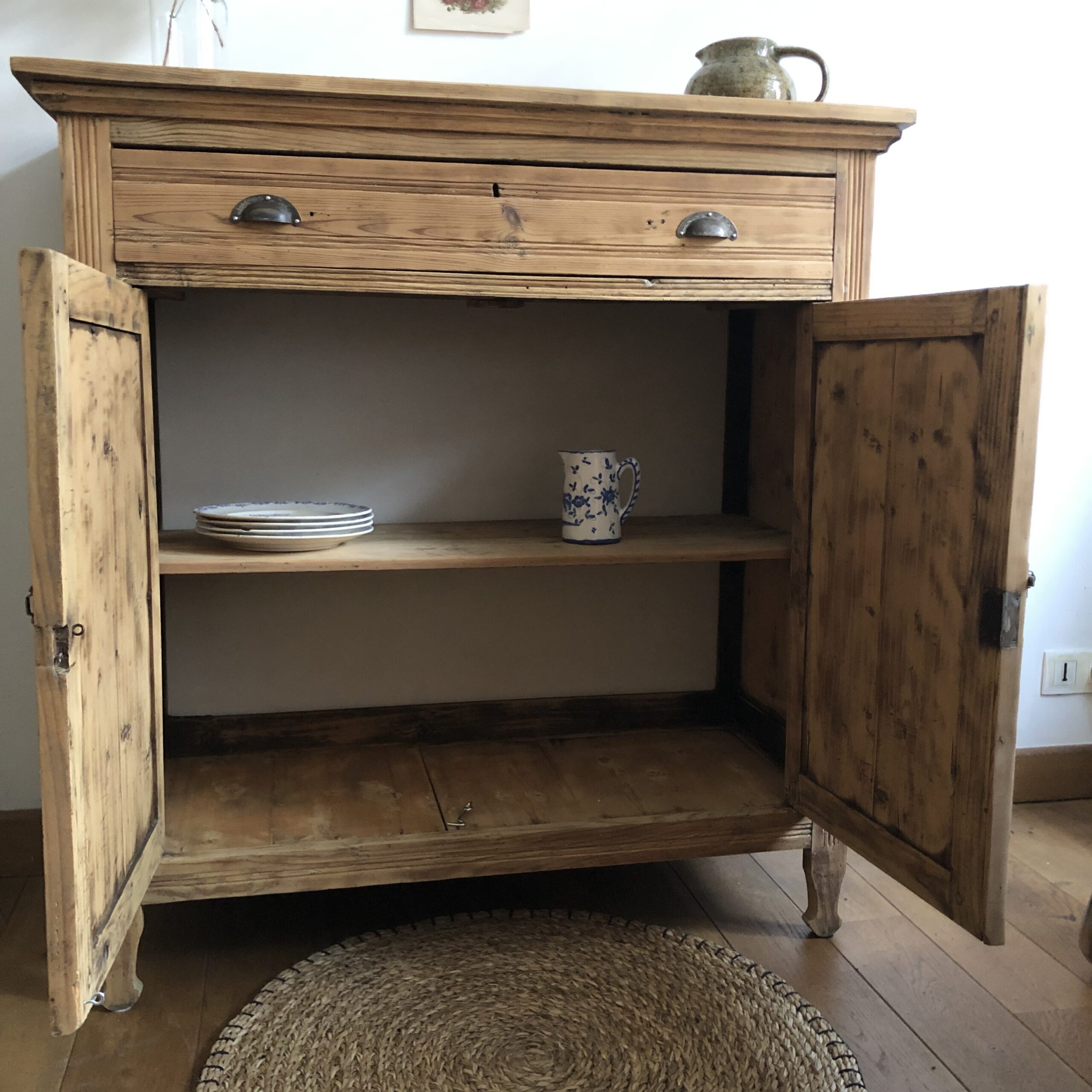 Il est composé d’un tiroir et de ses jolies poignées coquilles et de deux portes se fermant par un petit verrou.